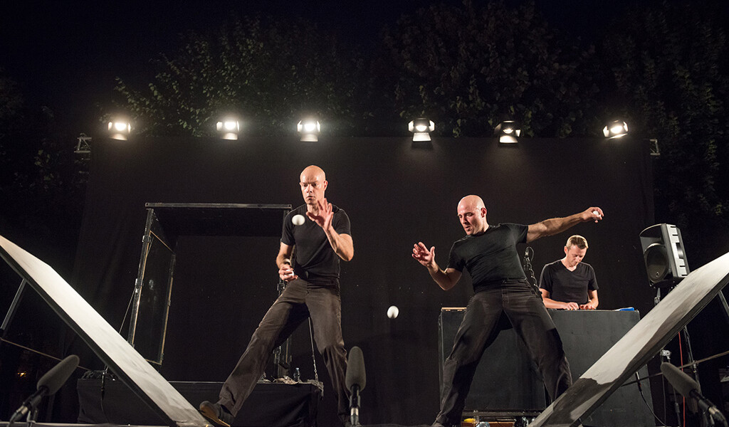 Les musiciens transforment leurs objets et leurs corps en instruments de musique, les frappes et les rebonds en notes, les vibrations en rythmes, les trajectoires en roulements de tambours et les chutes en silences…