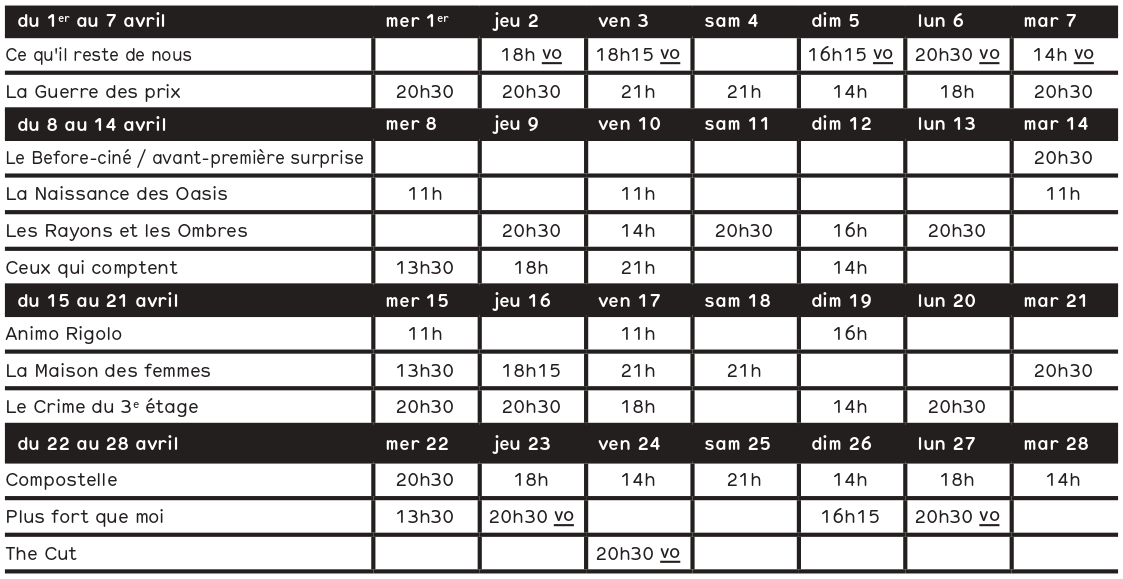 Télécharger le programme de vos séances du 1er au 28 avril ICI